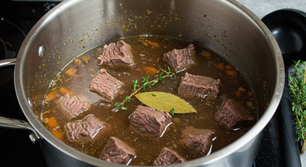 Return the browned beef to the pot, then add the beef broth, dried thyme, and bay leaves. Bring the mixture to a boil, then reduce heat to maintain a gentle simmer. Cover and cook for about 45 minutes until the beef becomes tender.